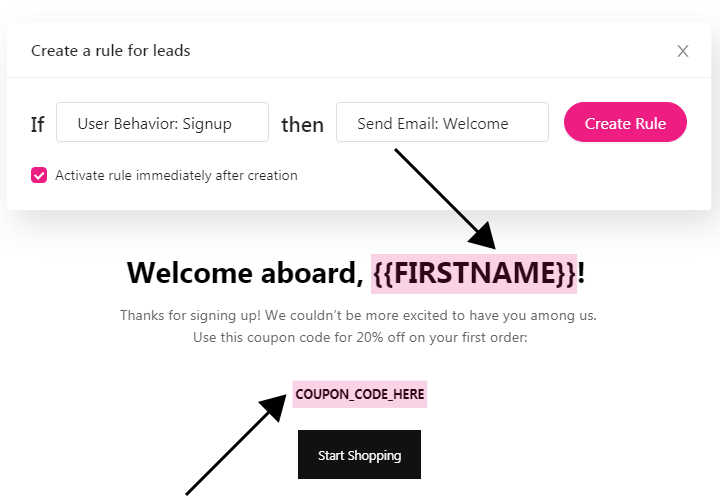 In Growmatik you can achieve this by creating an automation rule in the Leads section. Set the condition as User behavior: Signed Up and the action as Send Email. Select and customize Subscriber Welcome or another ready-made email template. Add the name of the subscriber, a discount coupon, and any other dynamic elements to your email before sending it.