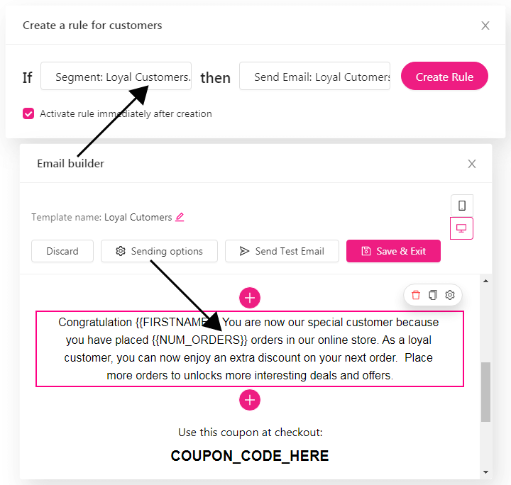 You can use the dynamic keyword elements in Growmatik’s email builder to include personalized info like customer name or number of purchases. You can also use the Dynamic product element to suggest what your customers can buy with the coupon.