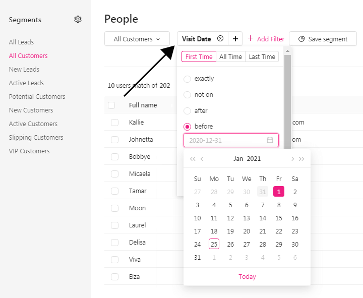 The process in Growmatik is similar to the previous example. For segment targeting, go to the People section. There, create a custom segment by choosing All Customers and setting Visit Date as the filter, targeting all customers who have not visited during your campaign.